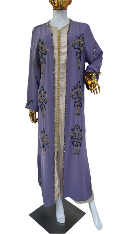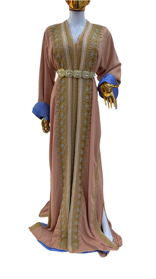 Caftan Bleu & Rose - Perlé Entièrement À La Main