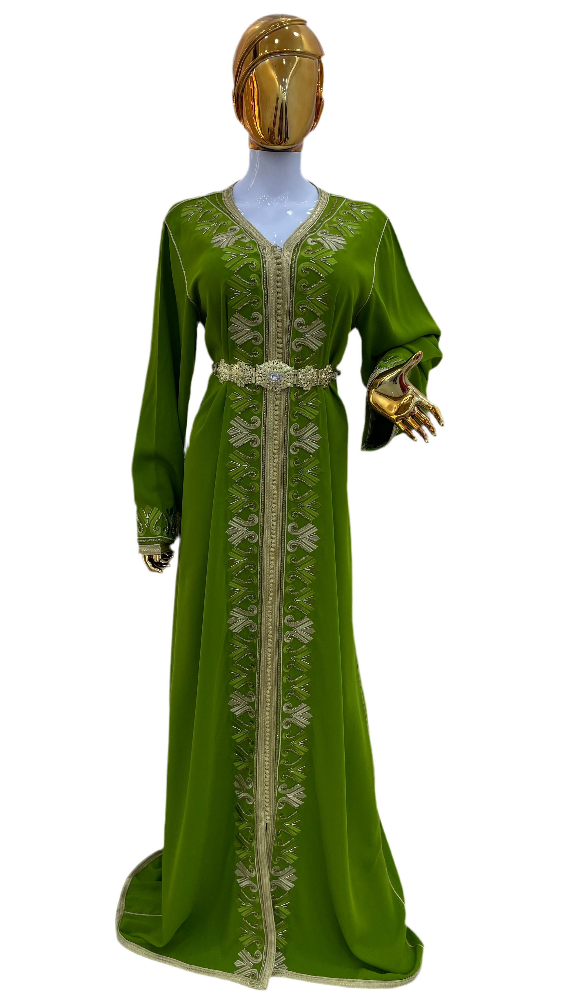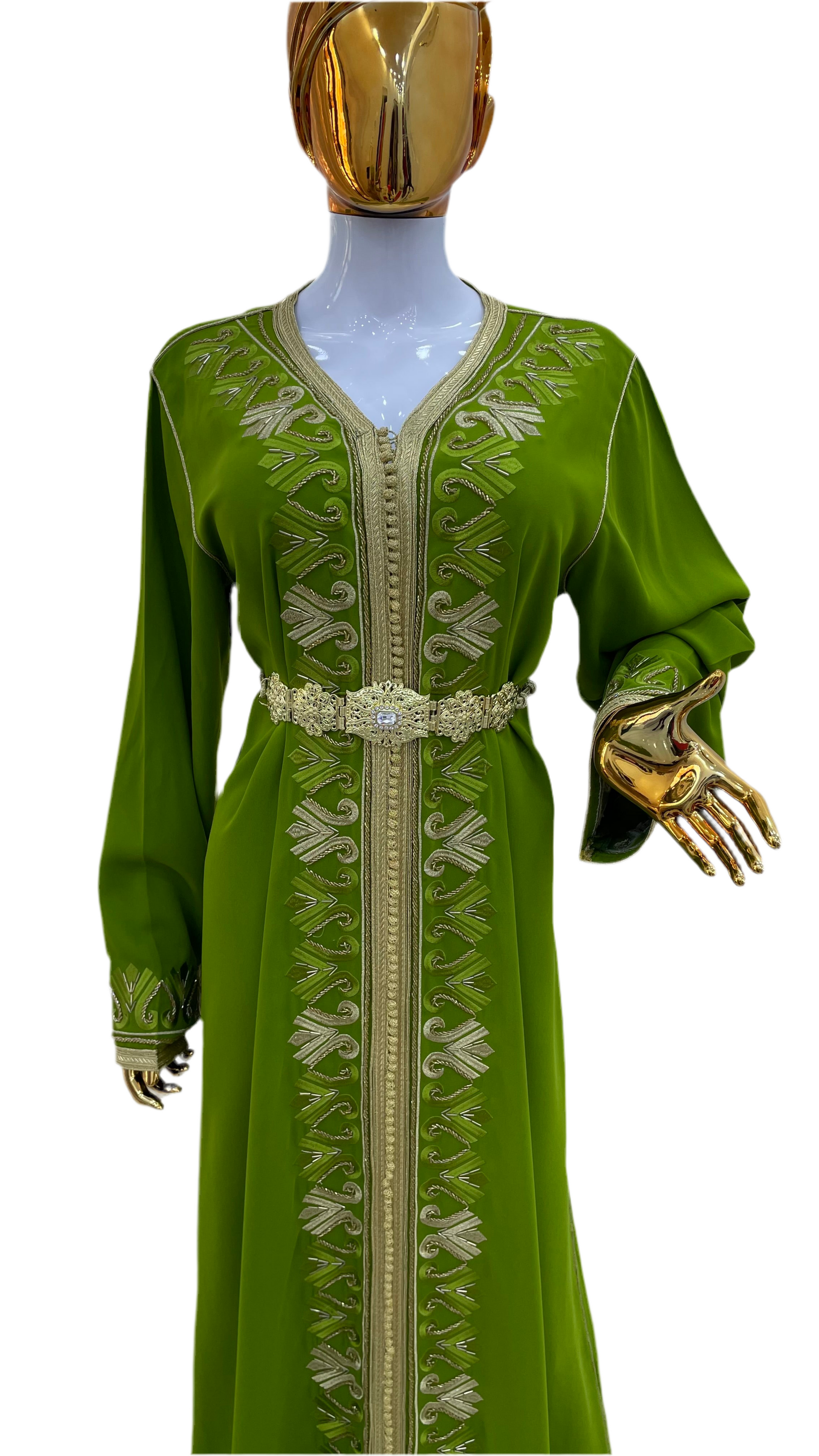 Caftan en crêpe de soie orné de broderies dorées raffinées et de finitions en sfifa. Ce modèle élégant, accompagné de sa ceinture assortie, est idéal pour vos occasions.