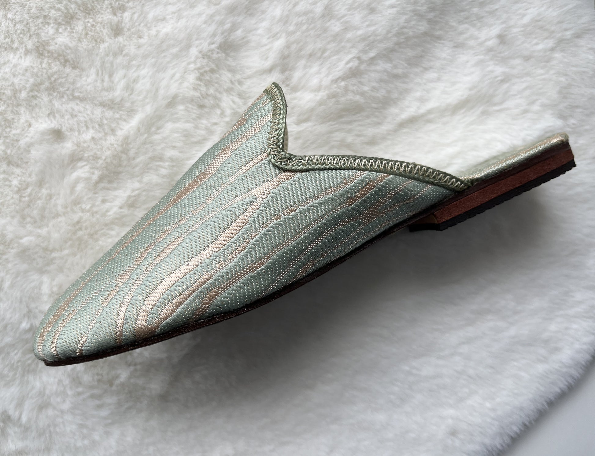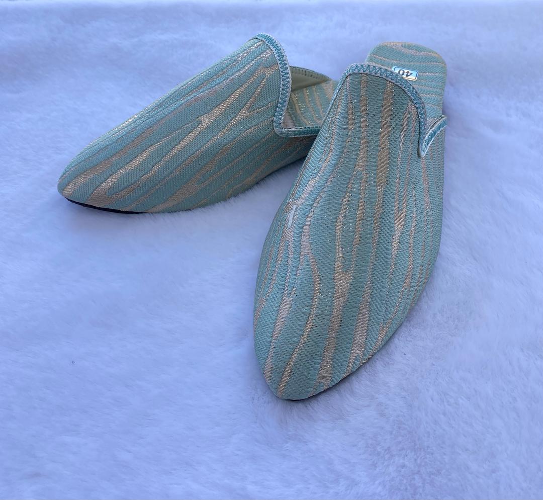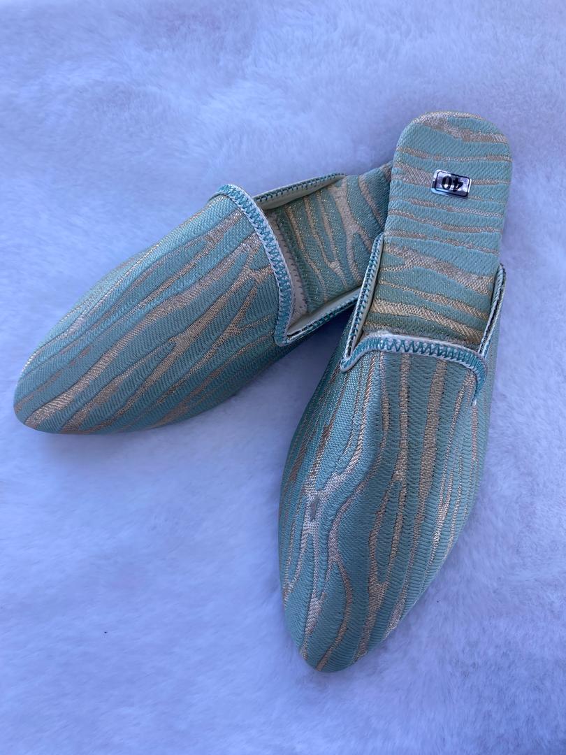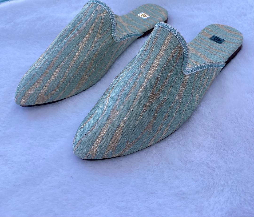 Cette babouche artisanale allie élégance et tradition avec son tissu raffiné vert aux motifs dorés rappelant des ondulations naturelles. Son design épuré et sa finition soignée en font une pièce idéale pour compléter une tenue traditionnelle avec une touche de modernité. Légère et confortable, elle est parfaite pour les occasions spéciales ou le quotidien avec style.