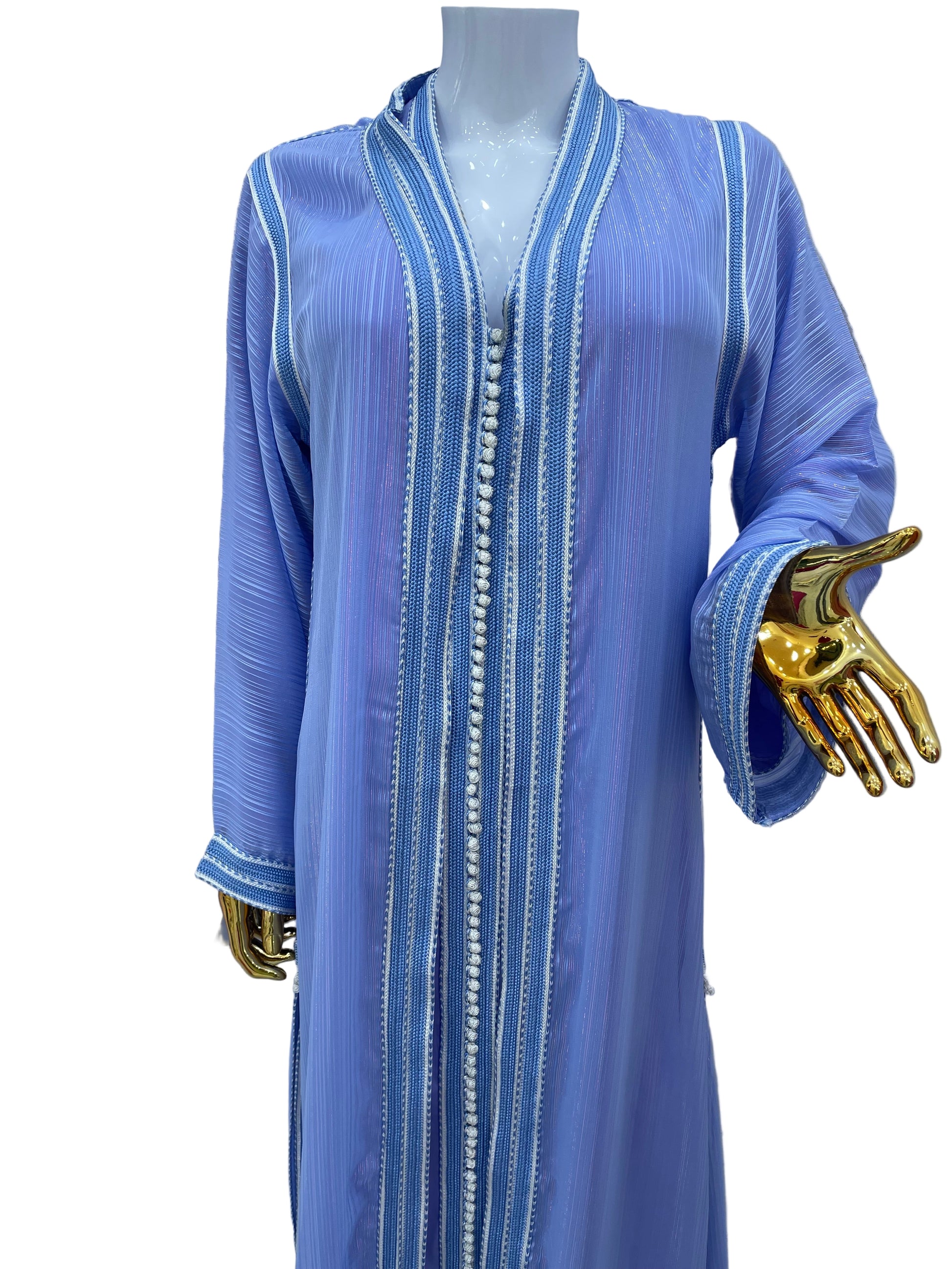 Ce caftan long séduit par son tombé fluide et son tissu texturé d’une grande légèreté. Confectionné dans une matière plissée en relief, il présente de subtiles touches brillantes qui lui donnent un aspect légèrement lamé, élégant et moderne – sans aucune broderie.