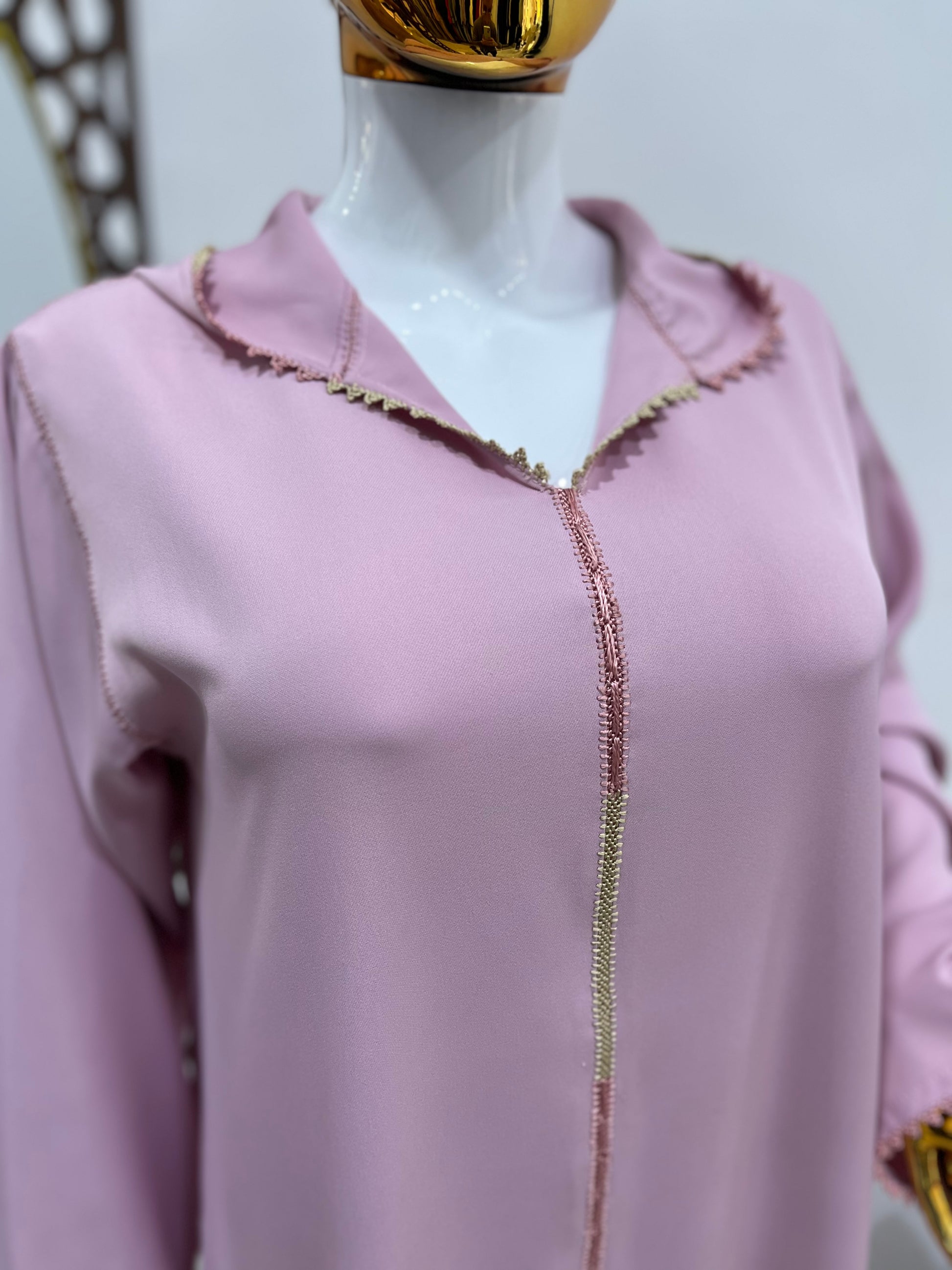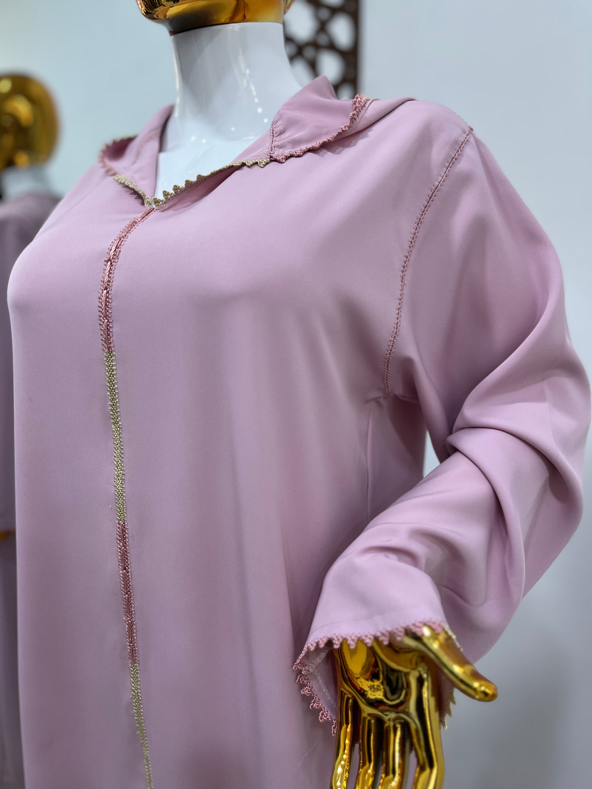Jellaba en crêpe léger, travaillée avec Randa (crochet), à la main, ton sur ton.