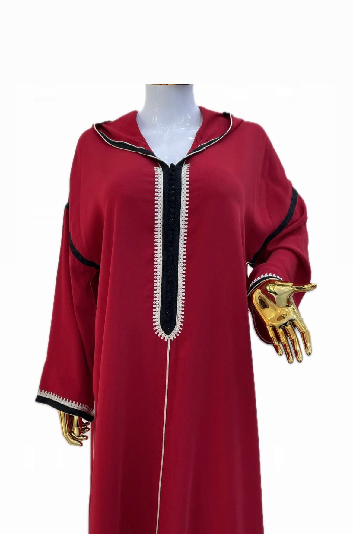 Affirmer votre style avec cette jellaba tricolore à capuche, sublimée par une sfifa et des touches en couleur qui illuminent l’encolure et les poignets.
